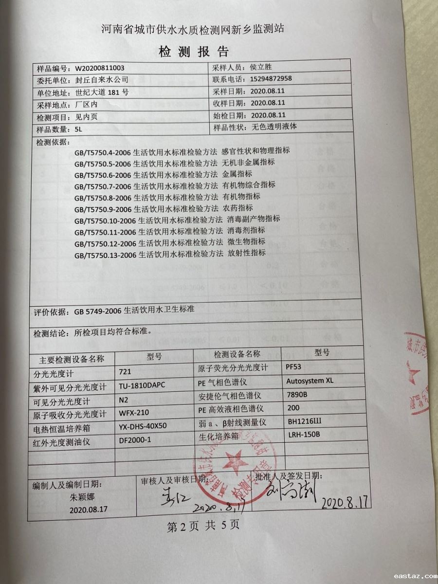 封丘县自来水公司——新乡监测站出厂水检测报告